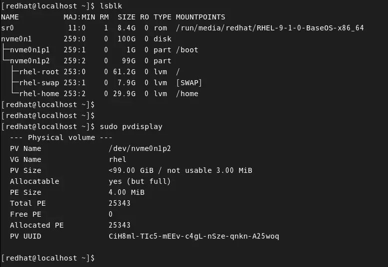 检查磁盘空间,使用 lsblk 和 pvdisplay 查看(演示增加 nvme0n1分区的空间)