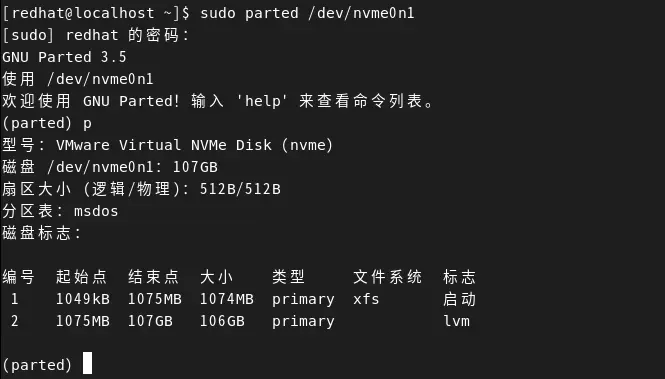 使用 print 命令查看当前分区布局,并记下要调整的分区的编号,如编号 2 :