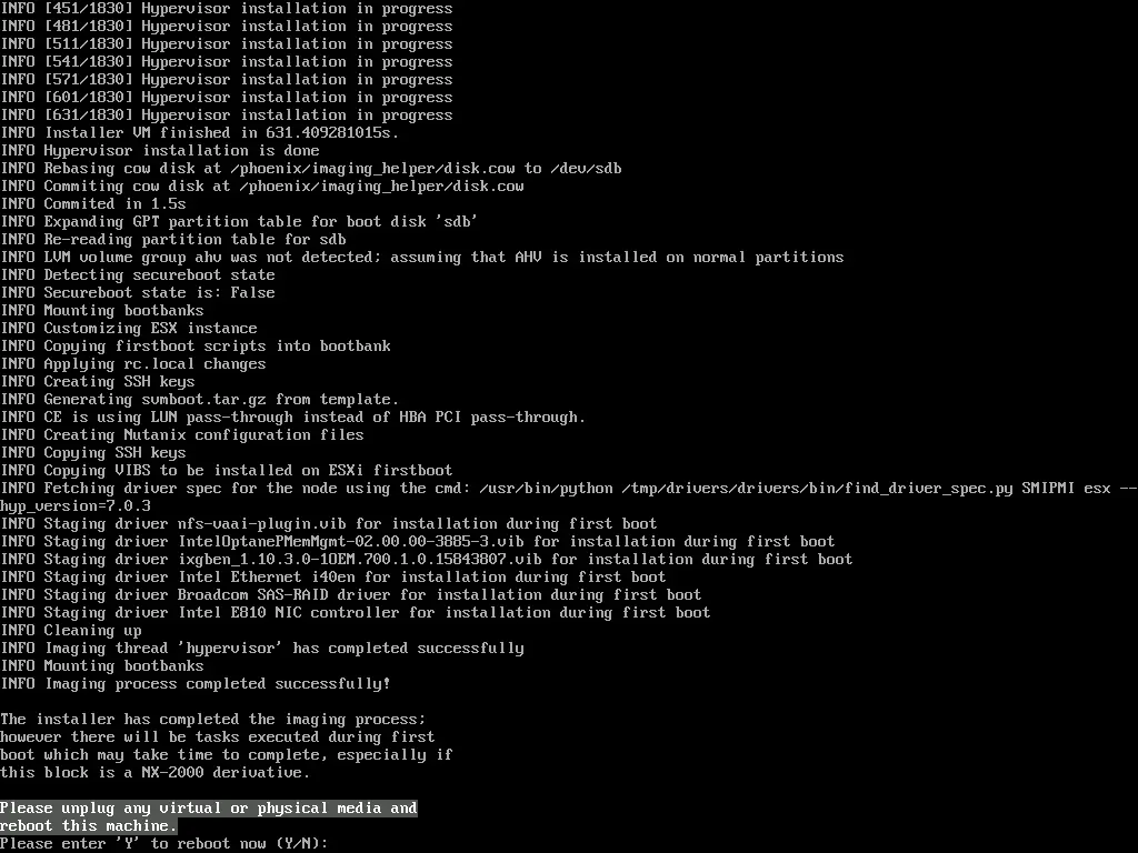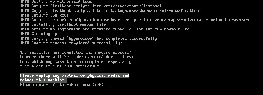 看到这个界面意味着安装程序已完成成像过程,移除安装介质后,选择“Y”进行重启。