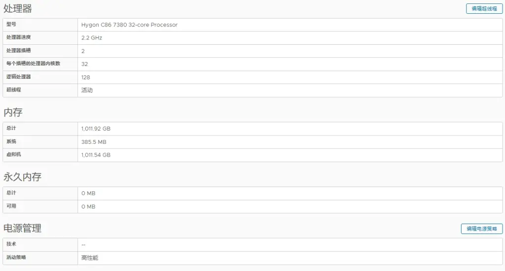 | 处理器 | Hygon C86 7380 32-core Processor 32 Cores 64 Threads ProcessorArchitecture x86 InstructionSet x86-64 2200 MHz L1:3072 KB L2:16 MB L3:64 MB TDP:220 | 2 |