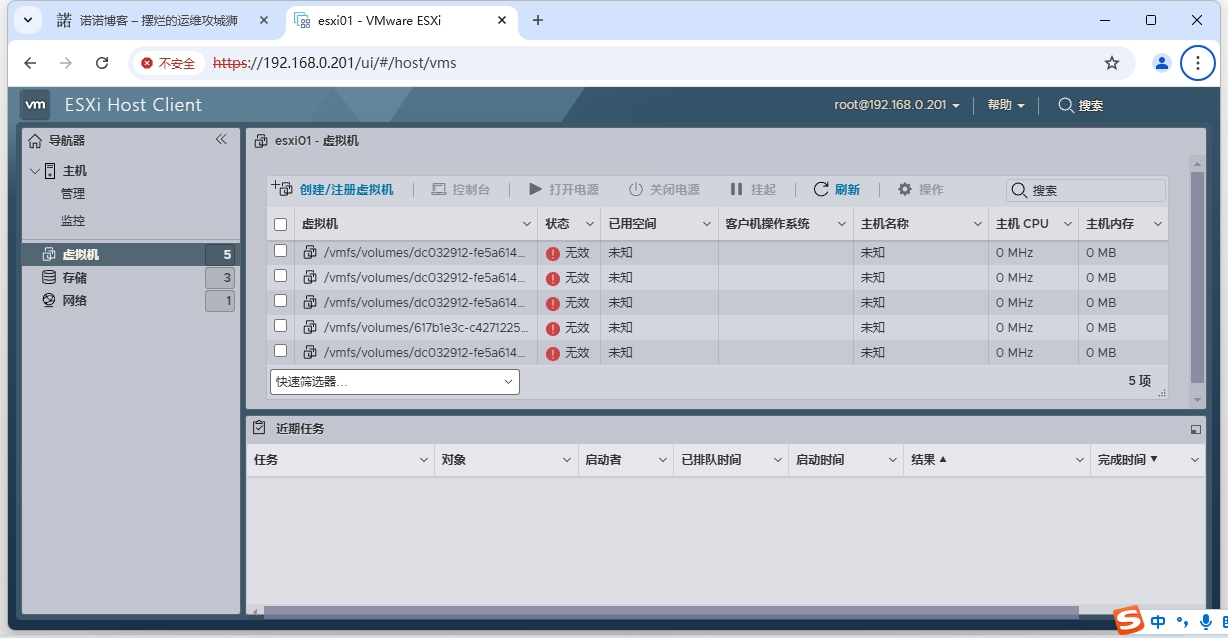 管理员经常面临这样一个情况:装有ESXI系统的服务器在强制关机启动后,显示虚拟机状态是无效的,并且无法进行任何操作,大概情况和下面这张图一样。