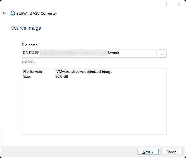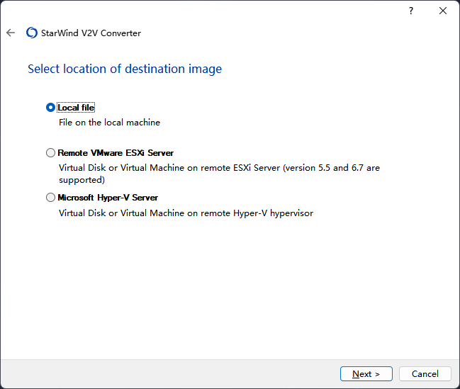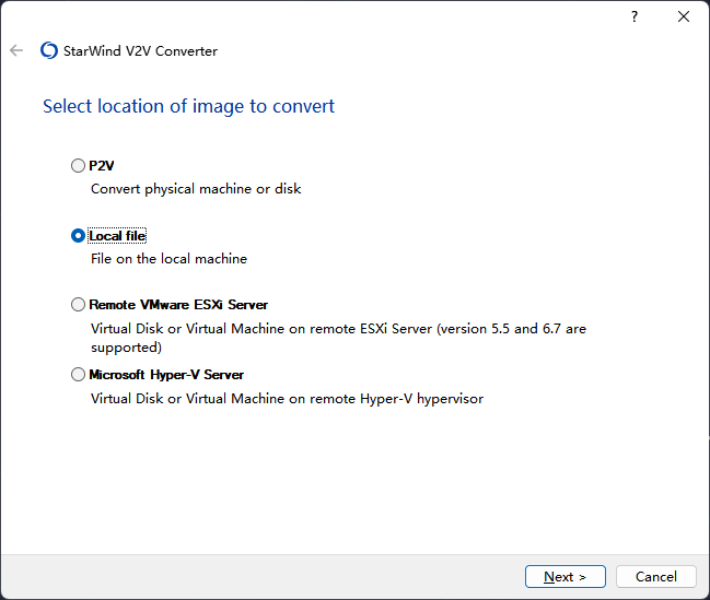 转换将使用 StarWind V2V Image Converter 进行,选择 “Local file” 并点击 “Next>”