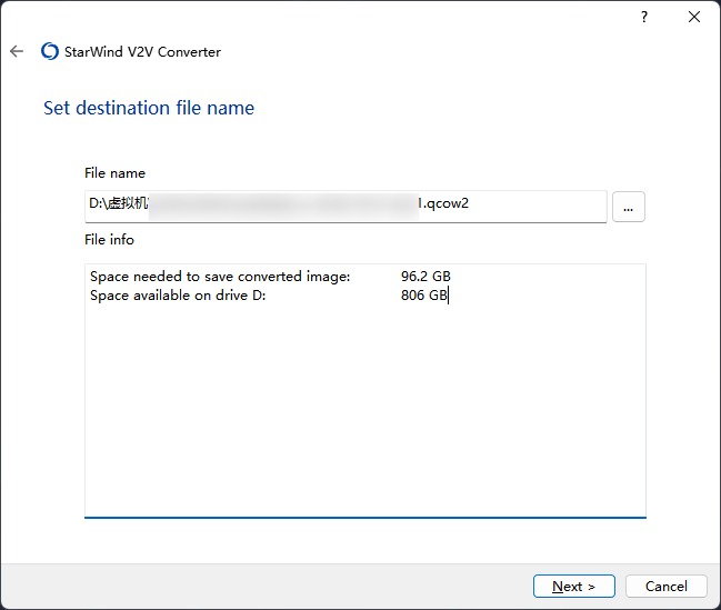 选择转换后文件名及存放路径, 并点击 “Next>”