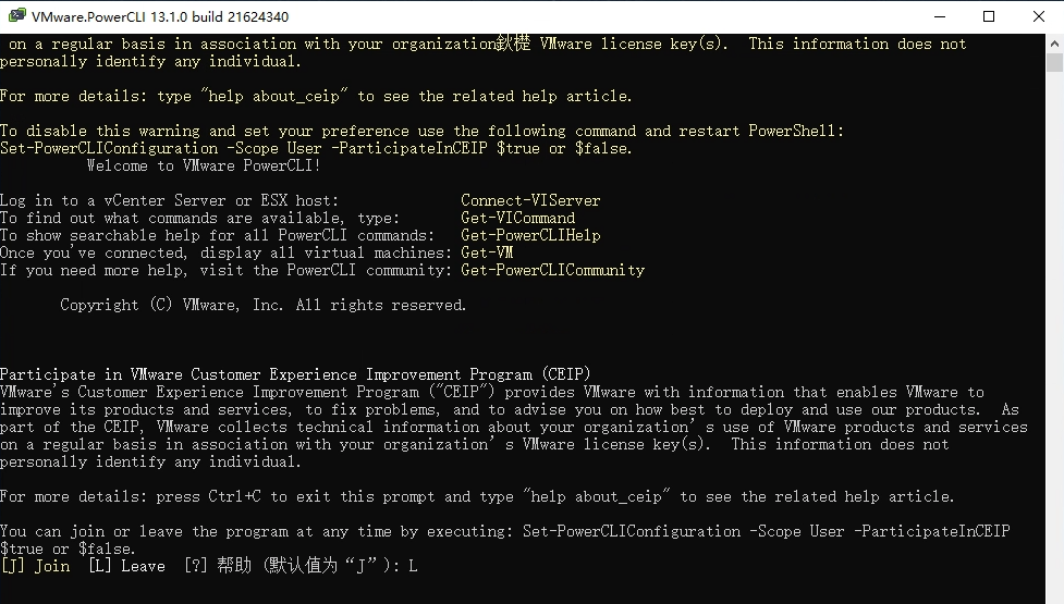 初次运行会提示是否加入VMware的客户体验改善计划(“CEIP”),选择输入”L”就行了