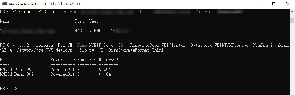1..2 | foreach {New-VM -Name NUONUO-TEST-00$_ -ResourcePool VDICluster -Datastore VDINTNXStorage -NumCpu 2 -MemoryMB 4 -NetworkName "VM Network" -Floppy -CD -DiskStorageFormat Thin}