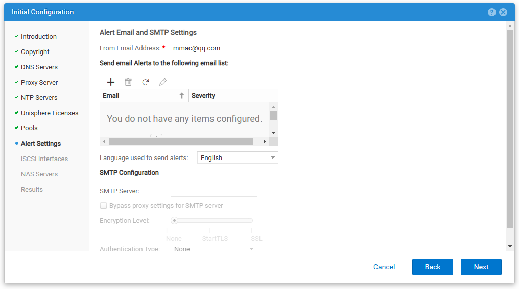 进入管理界面后,开始通过初始化向导进行配置。通过这个向导将对IP、DNS、NTP、存储池、iSCSI接口等进行配置。