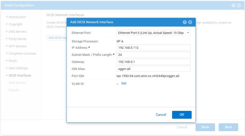 选择一个网络接口,前面介绍过UnityVSA会创建4个网口用作数据网络,Port0 ~ Port3。配置相应 的IP地址,IQN可以保持默认即可,也可以按需修改。