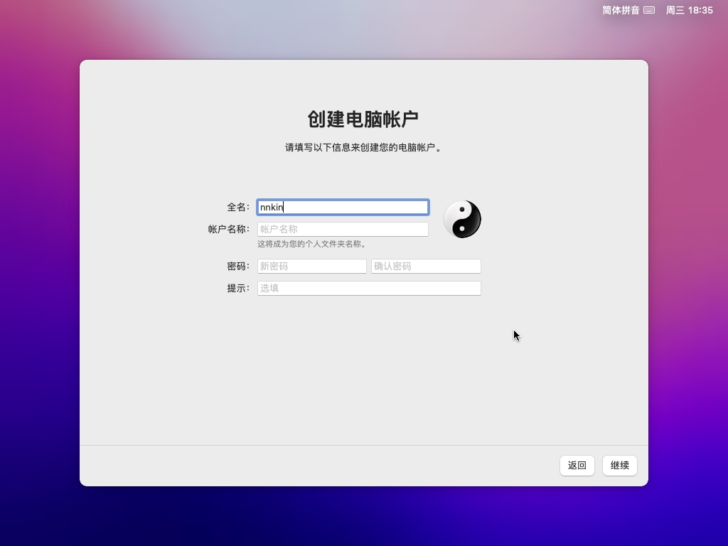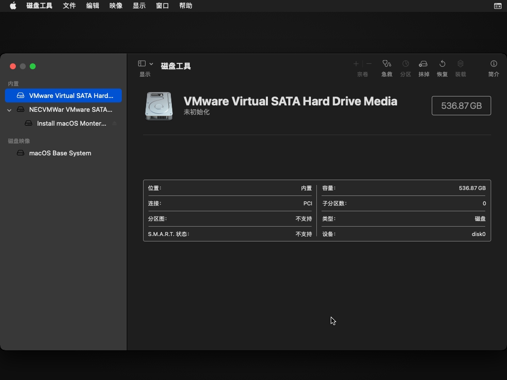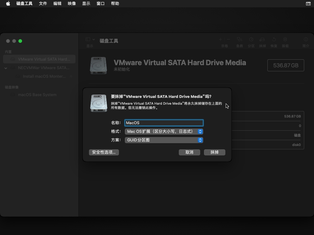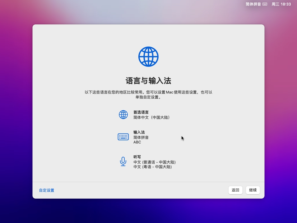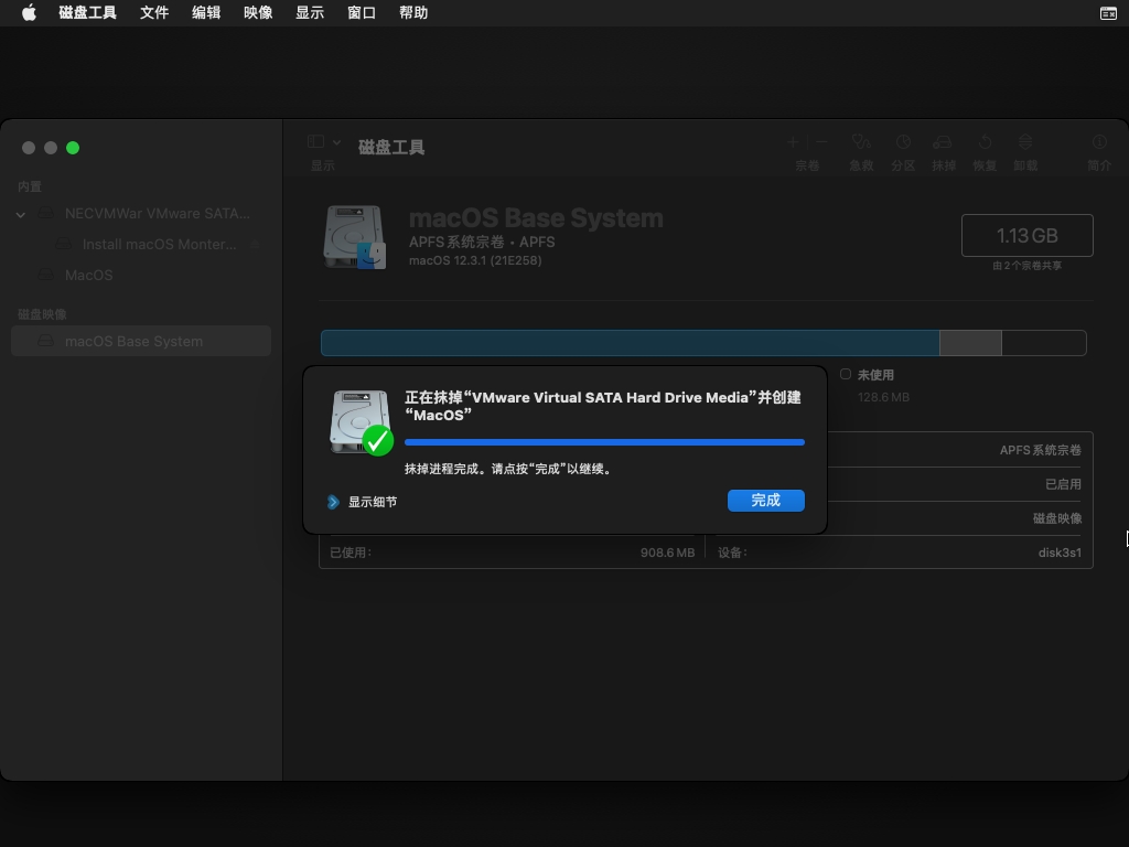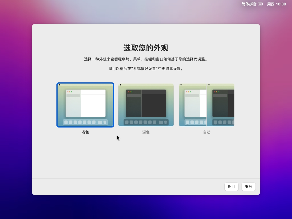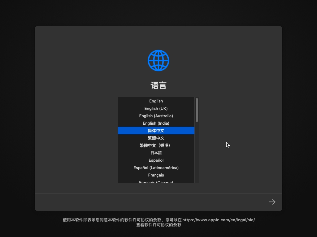 启动虚拟机并按照macOS安装向导进行安装。在安装过程中,需要选择安装语言并初始化硬盘、用户账户等,过程比较慢,需要耐心等待。