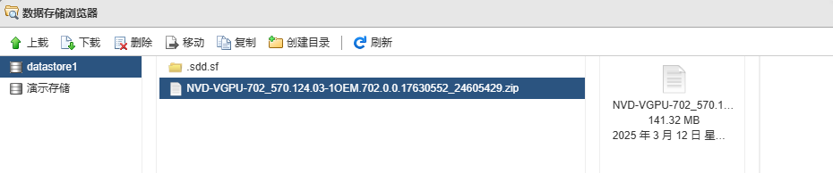 将 Host_Drivers 中的 NVD-VGPU-702_570.124.03-1OEM.702.0.0.17630552_24605429.zip 上传到存储中