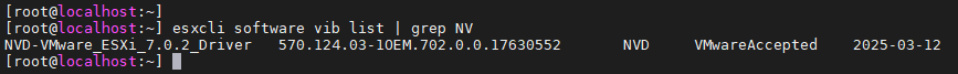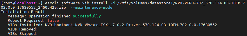 esxcli software vib install -d /vmfs/volumes/datastore1/NVD-VGPU-702_570.124.03-1OEM.702.0.0.17630552_24605429.zip --maintenance-mode