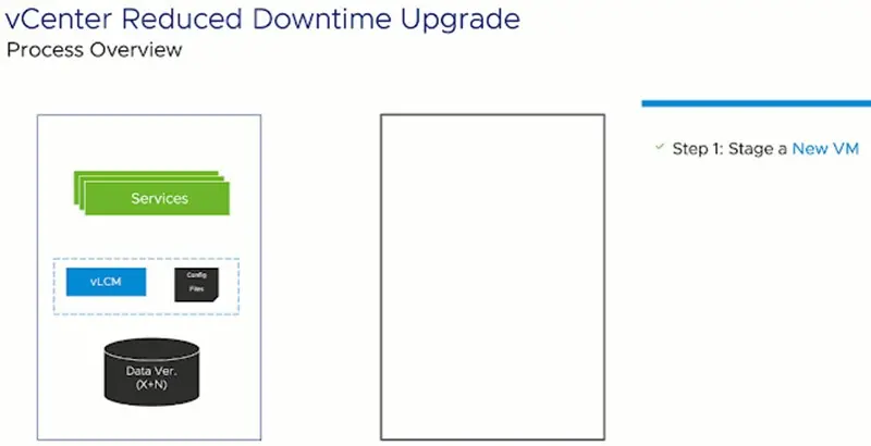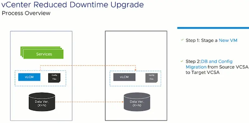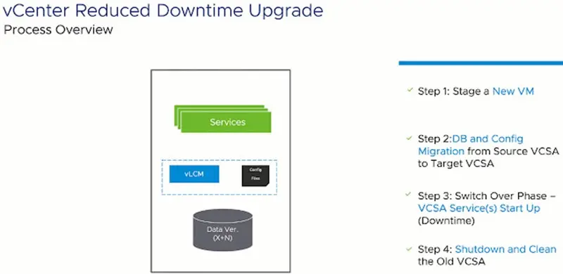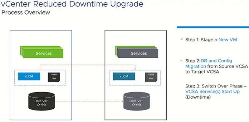 从vSphere 7 Update3 版本开始,VMware 官方开始将用于VMC on AWS 公有云环境中,版本更新和升级机制尝试落地,也就是由Project Arctic 专案所演化而来的API-Driven 技术,套用至企业和组织的地端资料中心内,推出vCenter Server Reduced Downtime Upgrade(RDU)特色功能,让vCenter 管理平台,在执行安全性更新或版本升级时,能够将停机时间最大化缩短,在最新的vSphere 8 Update 2 版本中,甚至能将版本更新或升级作业程序的停机时间限缩在5 分钟之内。