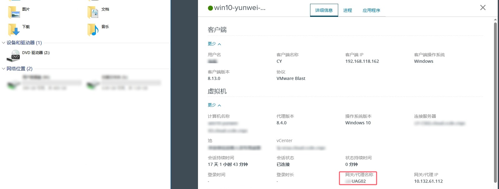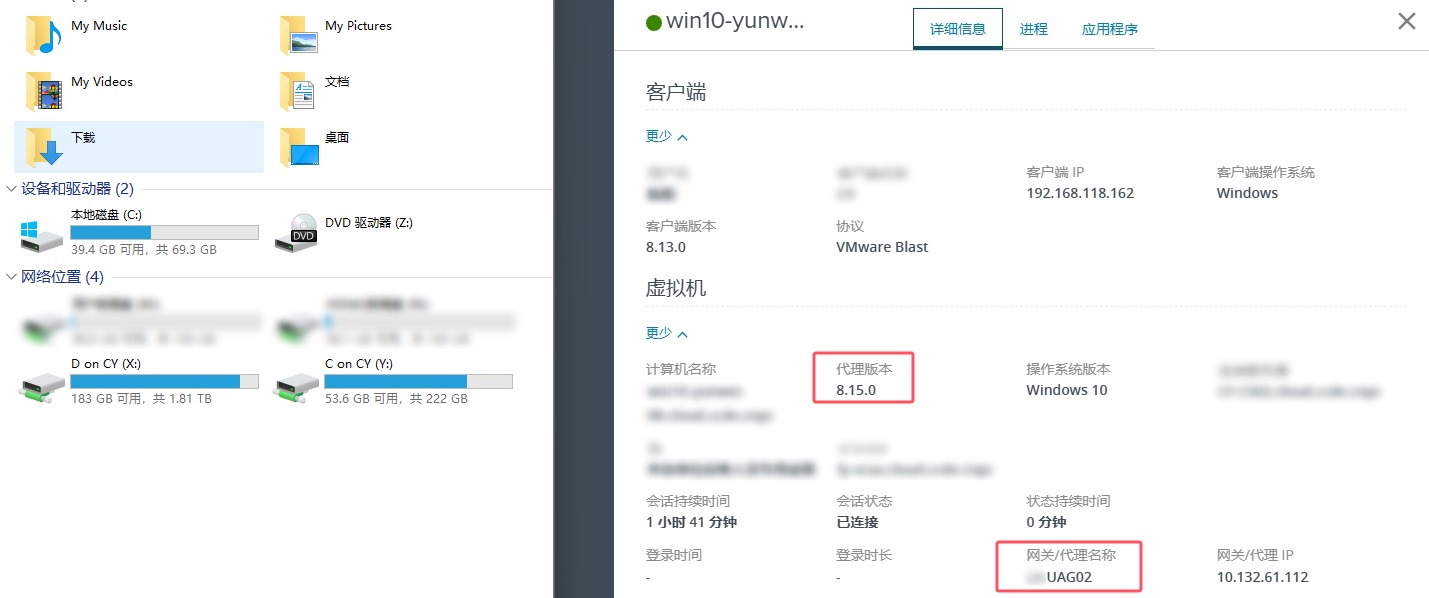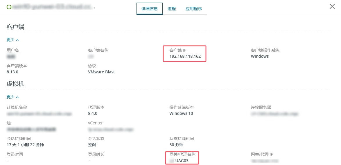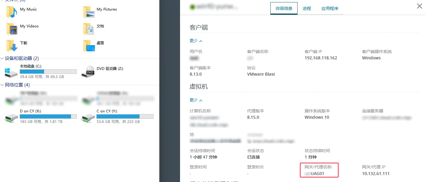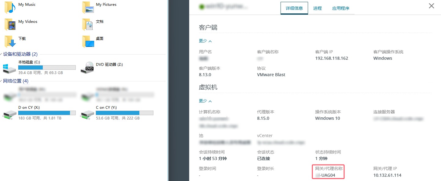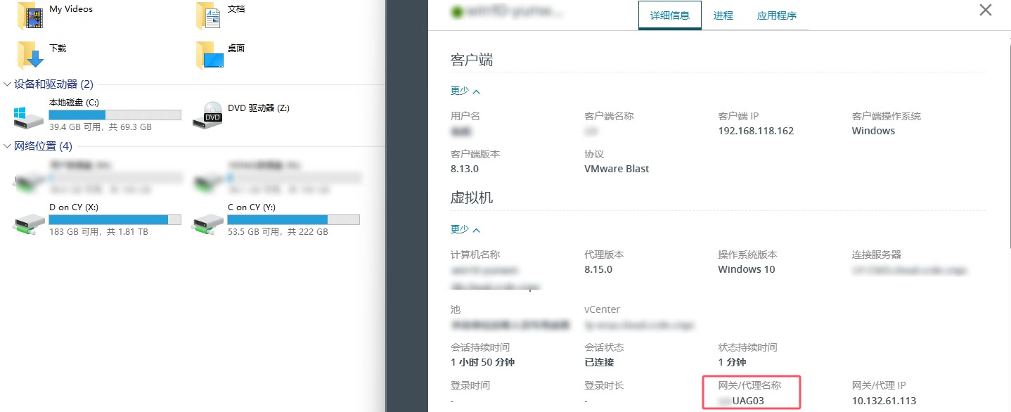 首次登录VDI,观察其使用的是UAG02,同时Agent版本是最新版本了,CDR也是正常映射的。