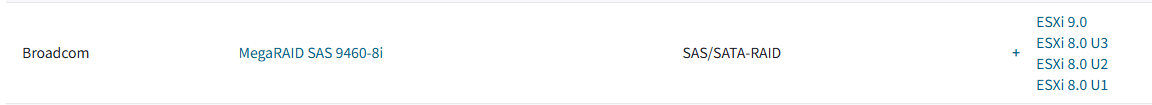 计划还是通过GPU直通将A100按需分配到虚拟机使用,所以还是使用vSphere这一套产品,当前最新版本8.0u3g,于是查看兼容性列表,最后选择了9460-8i: