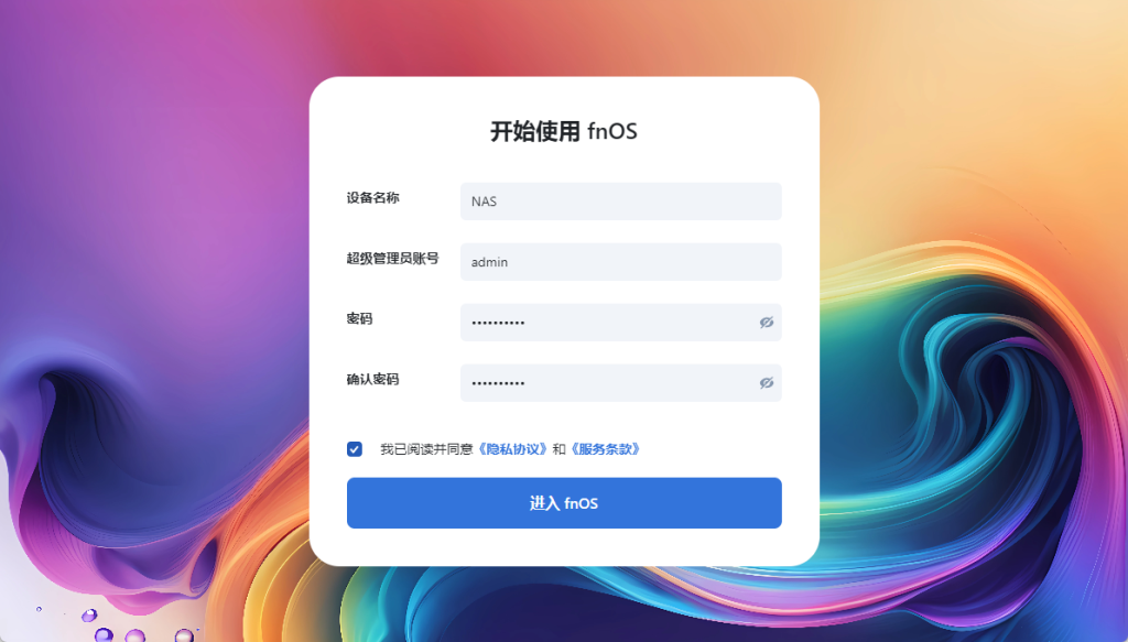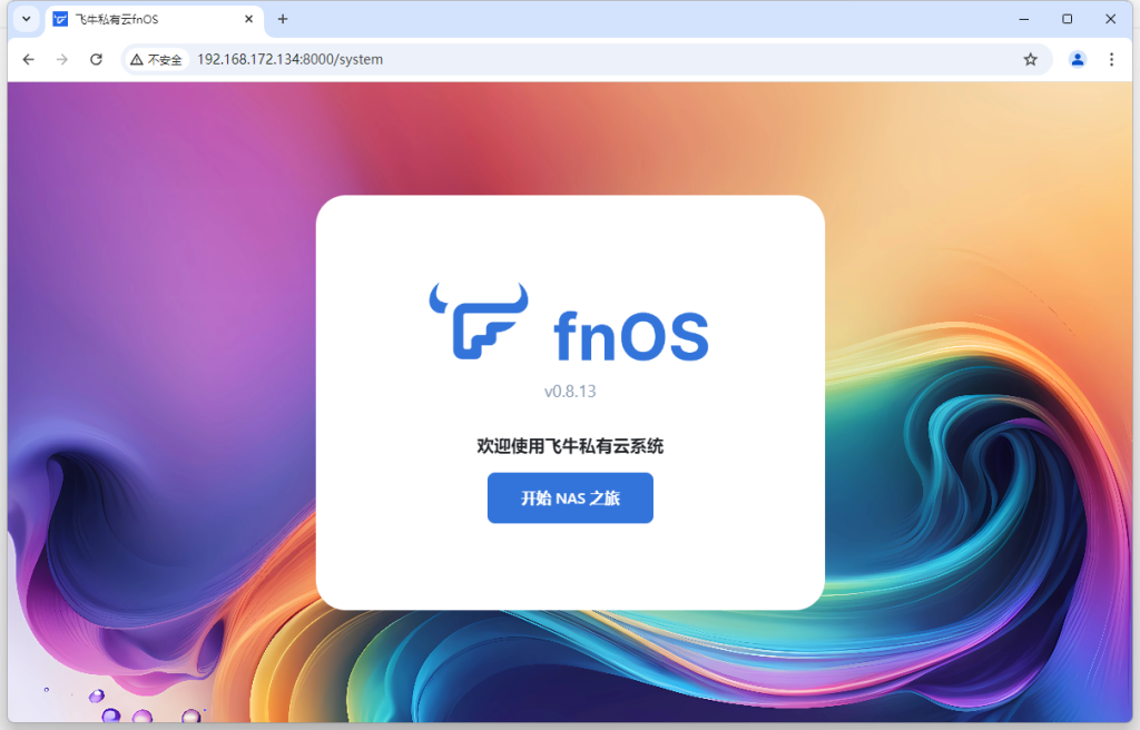 在电脑浏览器上访问上一步所设置的 IP 地址。首次进入 fnOS,你需要完成 2 项简单的系统初始化设置。点击 开始 NAS 之旅 进入初始化。