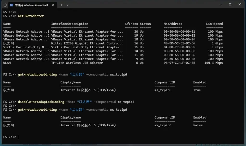 通过PowerShell方式关闭网卡IPv6的状态,虽然可以直接通过鼠标取消勾选,但特殊情况下是不能直接取消勾选的,如CORE模式(默认情况下不包含图形用户界面 (GUI)或者需要自动化的场景