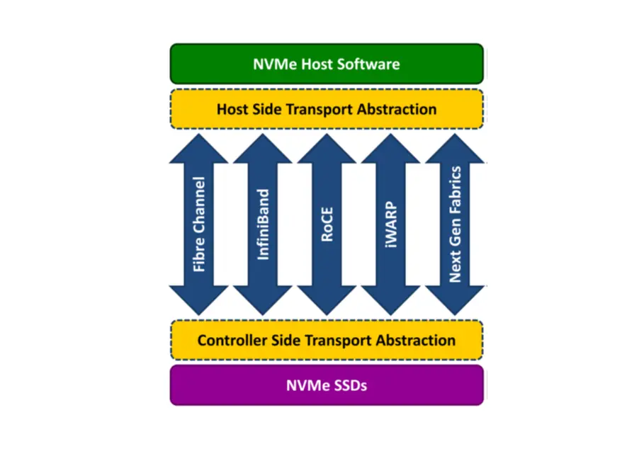 2016 年,NVMe-oF 行业标准已经推出。该协议规范将 NVMe 令人难以置信的性能从存储阵列控制器扩展到结构,使用以太网、光纤通道、RoCE 或 InfiniBand。 NVMe-oF 使用备用数据传输协议(通过结构)作为传输映射,而不是 NVMe 使用的 PCIe 总线。 Fabric 建立在端点之间没有共享内存的情况下发送和接收消息的概念之上。 NVMe 结构消息传输将 NVMe 命令和响应封装到一个基于消息的系统中,该系统包括一个或多个 NVMe 命令或响应。