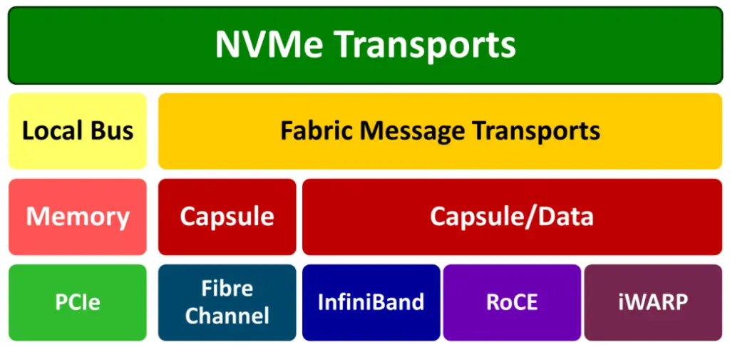 NVMe 支持和使用的三种结构传输类型是使用 RDMA 的 NVMe-oF、使用光纤通道的 NVMe-oF 和使用 TCP 的 NVMe-oF。