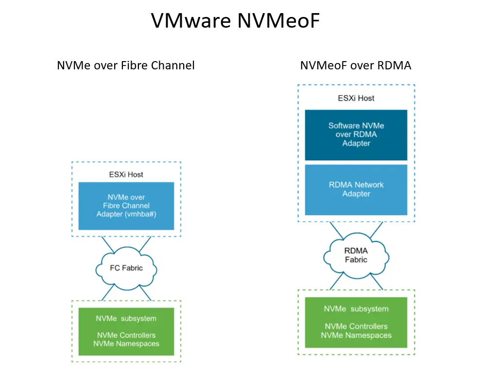 VMware 添加了对使用 NVMe-oF 的共享 NVMe 存储的支持。 对于外部连接,vSphere 7.0 支持 NVMe over Fibre Channel 和 NVMe over RDMA。 ESXi 主机可以使用 RDMA over Converged Ethernet v2 (RoCE v2)。 要使用 RDMA 启用和访问 NVMe 存储,ESXi 主机使用主机上的 R-NIC 适配器和 SW NVMe over RDMA 存储适配器。 必须在两个适配器中配置配置以将它们用于 NVMe 存储发现。