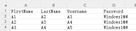 首先需要创建一个csv表项,假设文件名为users.csv,文件格式为:"FirstName,LastName,Username,Password"