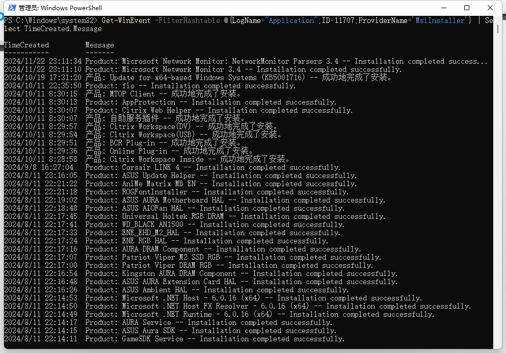 Get-WinEvent -FilterHashtable @{LogName="Application";ID=11707;ProviderName='MsiInstaller'} | Select TimeCreated,Message