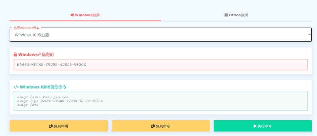 访问 KMS服务器 在列表中选择对应的操作系统,例如我当前系统是Windows10专业版,选择复制命令。