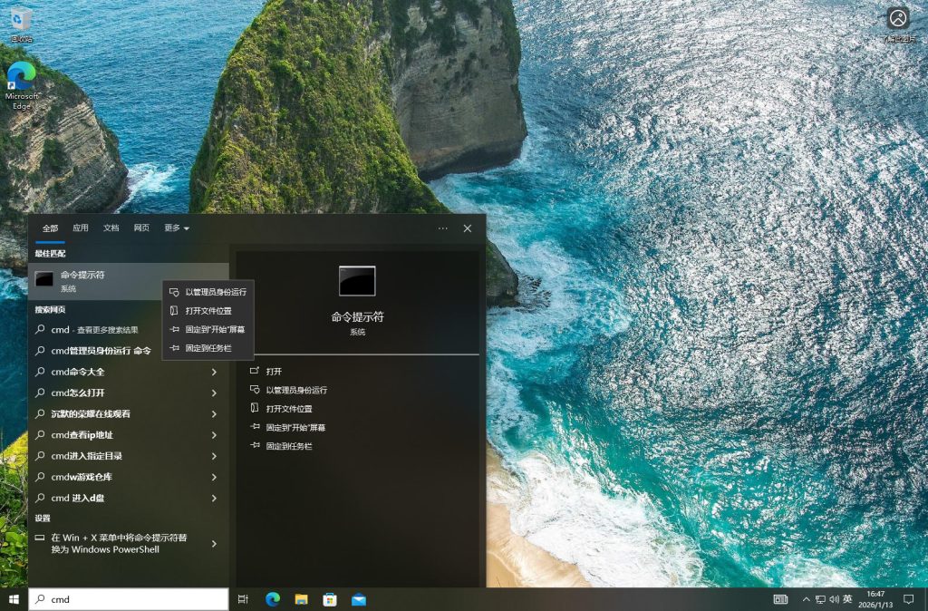 待安装结束后,使用同样的方式:点击 “开始” 输入 “cmd” 以管理身份运行 “命令提示符”