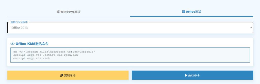 同样的方案,在刚才的KMS服务器 中选择对应版本的Office,例如我当前系统是Office 2013版本,选择复制命令。