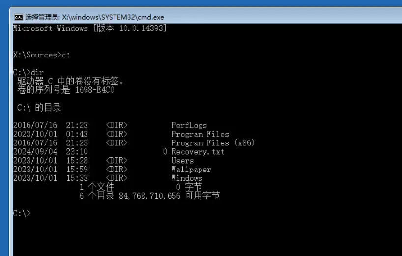 先确认C盘还是D盘是系统区 进去系统区可以dir看下是否系统分区,这个很重要,进错了系统分区那你下面的步骤是没有的)