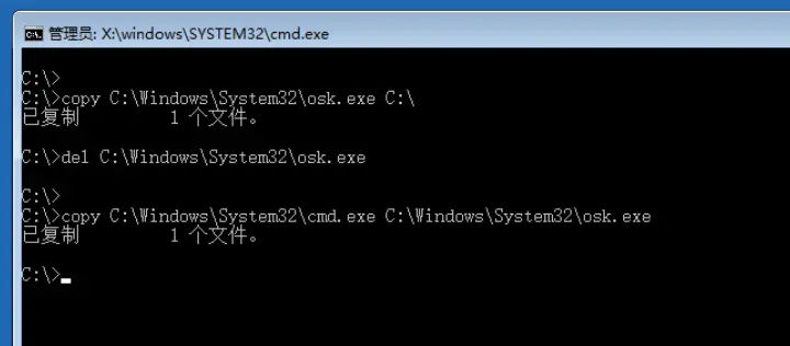 C:\Sources>copy C:\Windows\System32\osk.exe C:\ ###先copy这个osk.exe文件备份至D盘根目录
