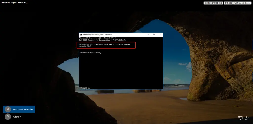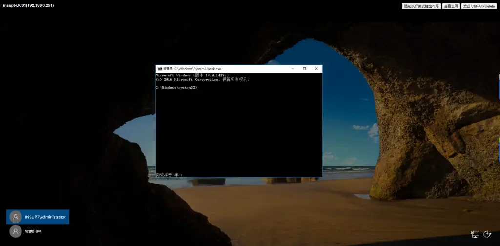 然后会出现以下画面,这里由于我们已经把真的 osk换成了cmd.exe,所以出现的是cmd界面