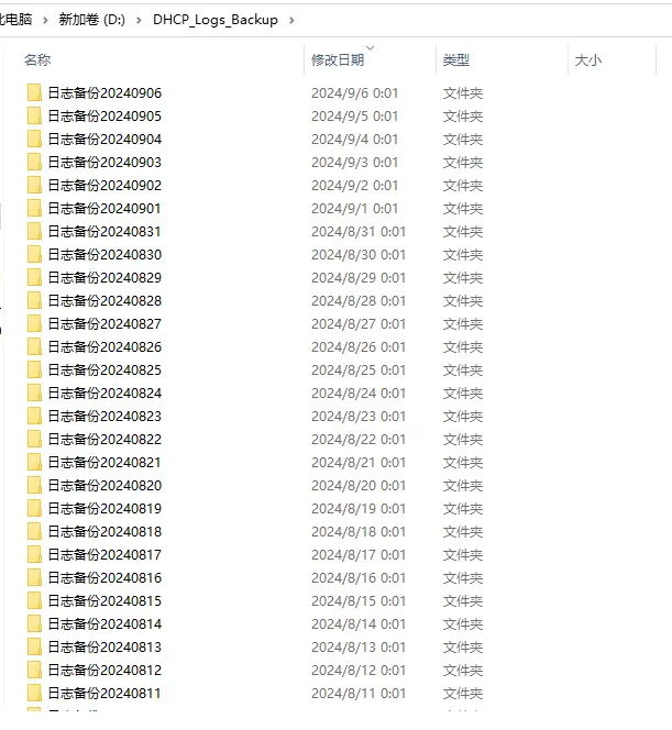 xcopy /e "C:\Windows\System32\dhcp\DhcpSrvLog-Mon.log" "D:\DHCP_Logs_Backup\日志备份%date:~0,4%%date:~5,2%%date:~8,2%" /H /Y