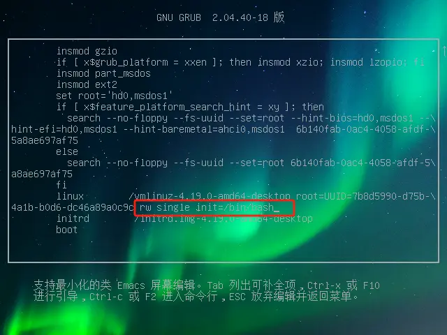 重启电脑,在引导彩蛋时按 “e” 进入编辑模式;把 “ro” 后面替换为下面的代码。